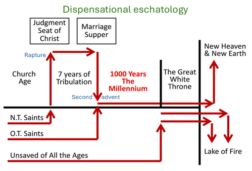 This study focuses on the question whether there will be a rapture and the question where in God's end-time scenario the rapture will take place. An important aspect in eschatoloy is dispensationalism. Below, is a schematic expression of events that will take place in several dispensations and on the edge of them. At the far left we see the church age dispensation, where we live in now. God's focus is on the church. At the end of that age the New Testament saints (believers that have died and believers that are still alive) will be taken up in the rapture (1 Thessalonians 4:13-18) and will spend 7-Jears in heaven. They will experience the rewards judgment and the wedding with the bridegroom Jesus, the Lamb. Non-believers remain those 7-years on earth and will experience the tribulation period. In the tribulation dispensation God's focus is on the Jews and Israel in unbelief. The rest of the graph is for another study.